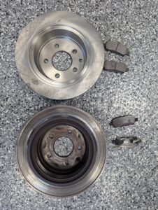 The photo may not do complete justice to the situation, but all four brake rotors on her car were severely worn and grooved because the brake pads were basically gone. Mechanics refer to this as metal on metal. Basically a hockey puck sliding along ice. The photo shows one of the rotors and the brake pads off of her car (bottom), next to a new rotor and new pads (top). Quite the contrast!